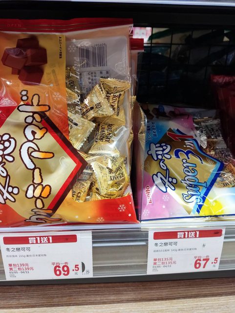 如照片只有這兩種有買1送1,吃過金色而已, 1包70來算1顆大概兩元,甜度能接受的話可買 架上售完很少補貨,看運氣遇到可買1組試試 這邊看到金色那包期限到今年10/16或11/07 https://i.imgur.com/QFAi5Ey.jpg