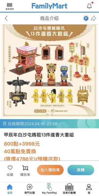媽祖前兩天開始進香繞境, 沒參加的應該可以買個模型來組也有媽祖保佑的效果(?誤 查momo上面的套件組是9件,7-11的更少組 全家這有13件感覺還是有便宜 喜歡玩積木、樂高的可以參考 https://i.imgur.com/GhVHDjx.jpeg