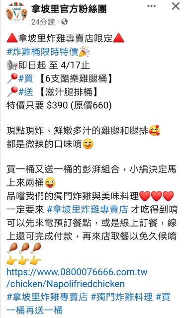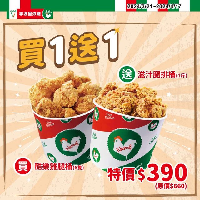 拿坡里炸雞買雞腿桶送腿排桶$390 拿坡里炸雞專賣店限定 炸雞桶限時特價 即日起 至 4/17止 買 【6支酷樂雞腿桶】 送 【滋汁腿排桶】 特價只要 $390 (原價660) https://i.imgur.com/K78I8Qw.jpeg