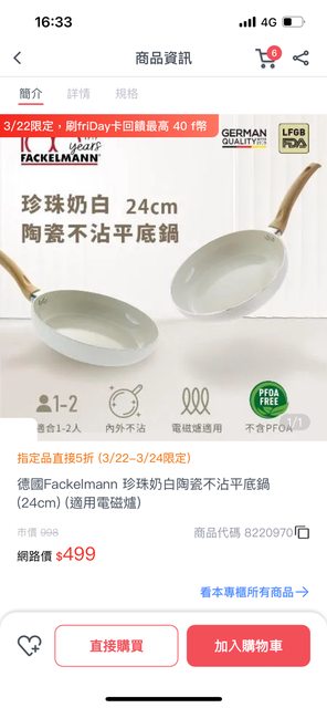 剛剛看到的! 德國法克漫24cm平底鍋$499 有遠傳幣用app 結帳可以兩倍放大 今天刷Friday卡還有8% https://i.imgur.com/D0LNGLM.jpg
