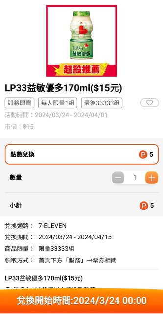 兌換開始時間 : 2024/3/24 00:00 LP33益敏優多 170ml($15元) 限量33333組,每人限量1組 https://i.imgur.com/4vAr6U2.jpg