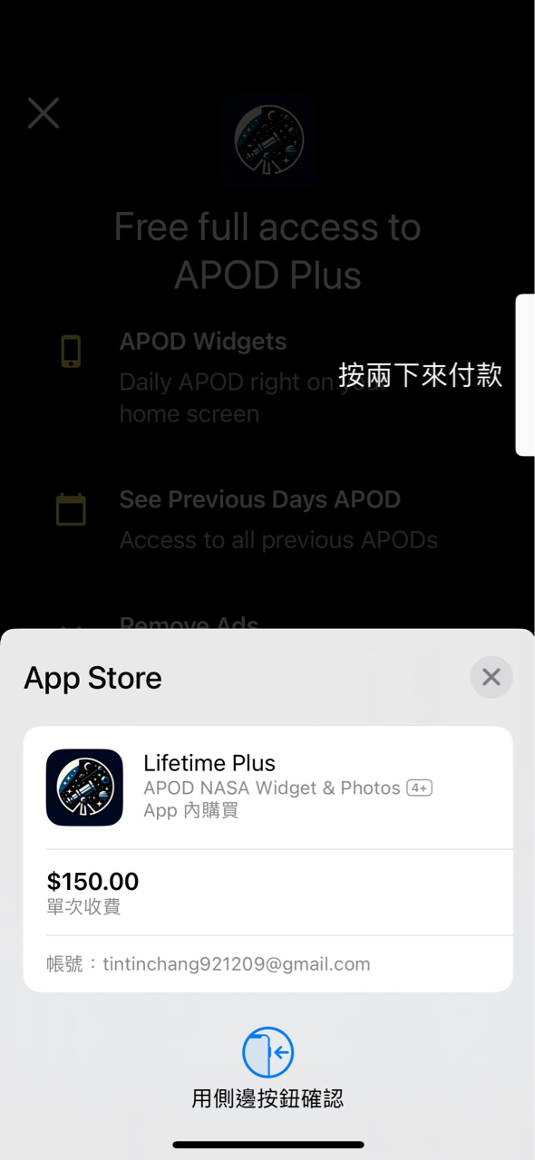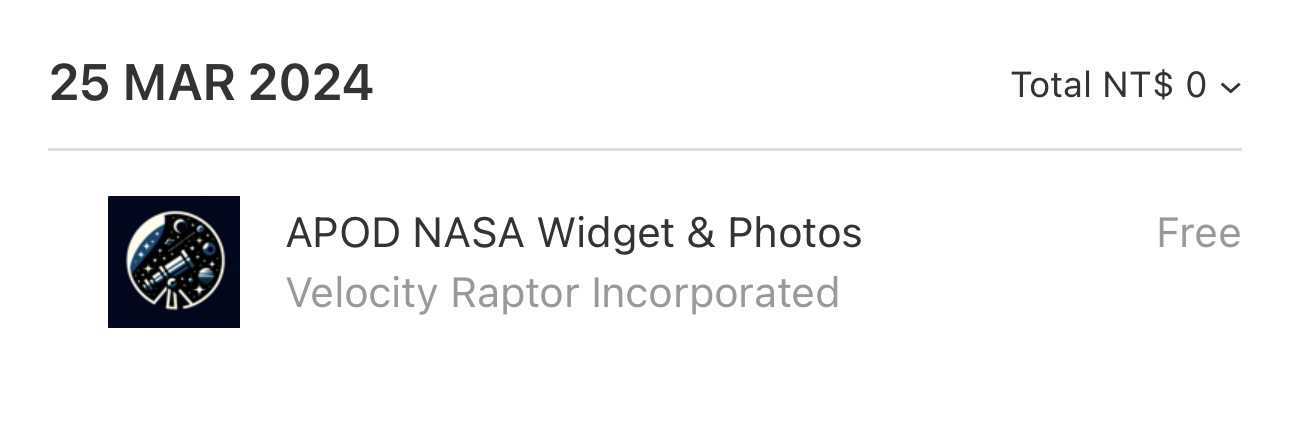 應該結束囉,可以不用載了 https://apps.apple.com/tw/app/apod-nasa-widget-photos/id305130762 推送高畫質的天文照片在widget 裝好打開下一步下一步 就可以看到現在免費 請確認是免費再按下訂閱 -- ※ 發信站: 批踢踢實業坊(pttsite.org.tw), 來自: 1.162.101.111 (臺灣) ※ 文章網址: https://pttsite.org.tw/Lifeismoney/M.1711372965.A.30C