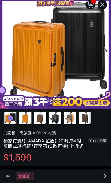 很多平台都有賣的牌子 比價後1599元這價格有便宜到 其他平台大多是賣3千多 特點:前開式、海關鎖、可加大、100%PC材質 24吋和20吋都一樣價格 傳送門:https://reurl.cc/WR5NAL 因為我還有領一張玉山300折價券 折後只要1299元真的很香 附上訂單 https://i.imgur.com/rnWmSap.jpeg