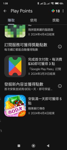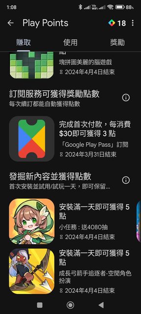 點選Play Points進入 安裝: 小任務:送4080 成長弓箭手追逐者-空閒角色扮演 左滑還有 糖果蘇打傳奇 安裝滿一天即可各獲得5點 https://i.imgur.com/tFkdWpg.jpg