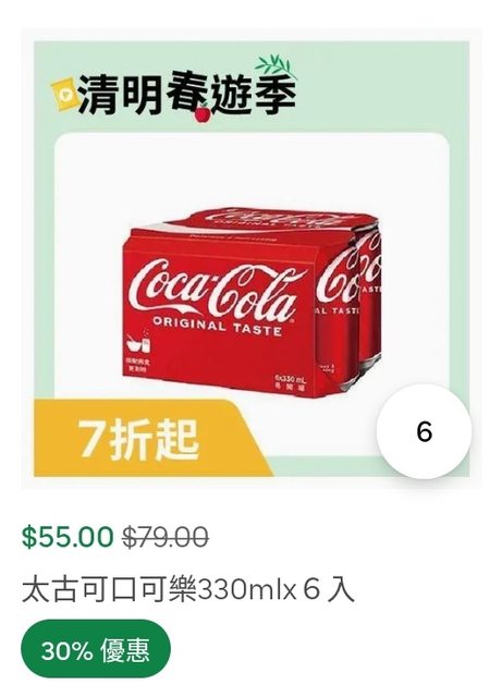 ubereat太古可口可樂特價了。 現在一手六罐55。 330ml*6。 一次最多6手 有uberone免運費的可以屯起來 肥宅先買了12手 https://i.imgur.com/RJPqF2I.jpg