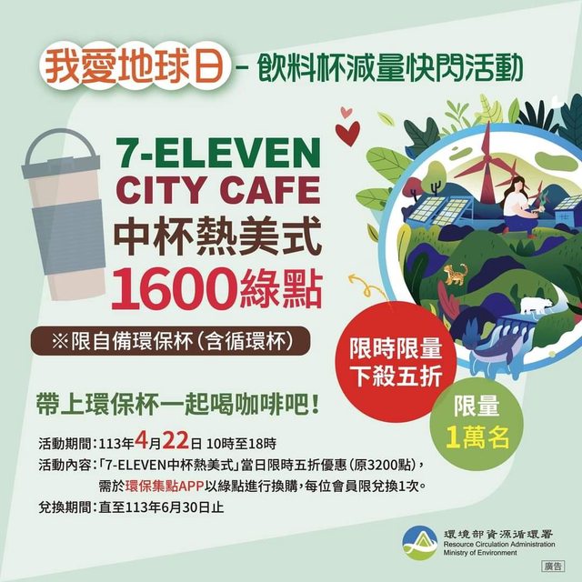 4/22自備環保杯可以用環保集點APP1600點換小七美式,請注意活動到下午六點