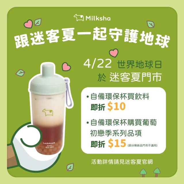 活動內容 : 凡自帶環保杯購買指定飲品享15元折扣