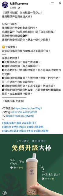 推 yulaw: 7-11自備環保杯退7元好像是連3天,到24號1.200.176.68 04/22 16:58