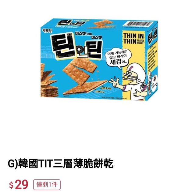 → aqn23520: 有買到三層餅乾跟花生醬油海苔片,不知 39.12.48.207 05/02 17:36