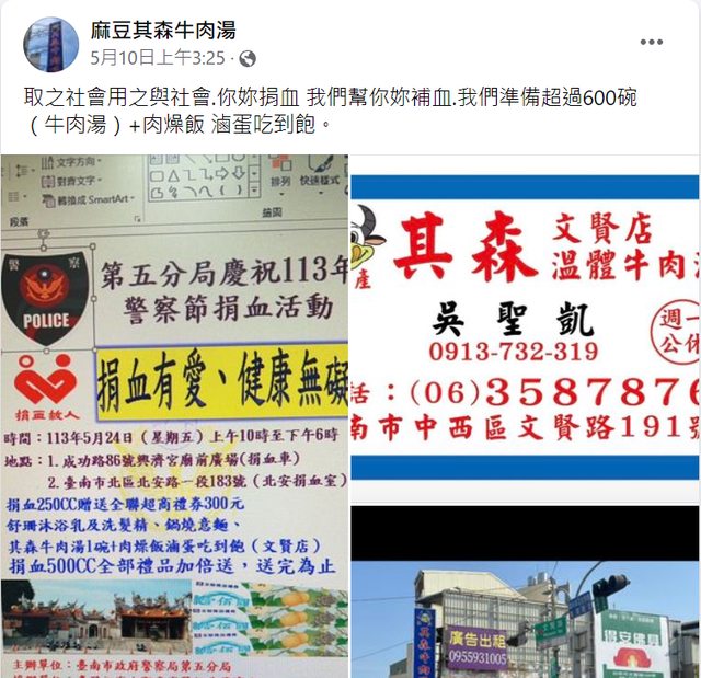 524台南捐血送: 1.全聯禮券300/600 2.沐浴魯、洗髮精、鍋燒意麵 3.牛肉湯、肉燥飯滷蛋吃到飽 捐血地點: 1.成功路86號廟前廣場 2.北安路一段183號 牛肉湯地點: 文賢路191號 時間: 5/24 10:00~18:00 注意事項: 送完為止 -- ※ 發信站: 批踢踢實業坊(pttsite.org.tw), 來自: 180.217.7.31 (臺灣) ※ 文章網址: https://pttsite.org.tw/Lifeismoney/M.1716143205.A.3B1