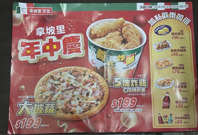 剛收到傳單5/23-6/5 又有大披薩和炸雞199元了 但不曉得是不是只有台中逢甲店 左下角有印店址。不限口味就是讚 https://i.imgur.com/rEks1f4.jpeg