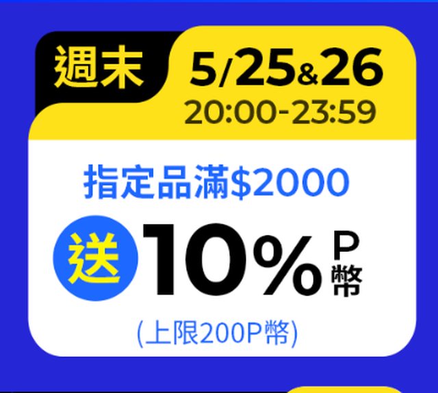 3. 5/25、5/26 20:00-24:00 全站指定品消費滿2000送10%P幣,最高200P幣 https://i.imgur.com/cgVHETO.png