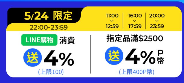 4. 5/24 11:00-13:00、16:00-18:00、20:00-24:00 <P幣>滿2500送4%P幣,最高400P幣 22:00-24:00 <LINE購物>回饋4% line points,上限100 https://i.imgur.com/oj4IWkG.png