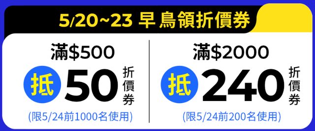 這個月的24力其實也有搶240券的活動,不過這次多了先領500-50和2000-240的券,明天可 以直接使用,雖然這個算人人都有,但明天還是要盡快使用,因為有數量使用限制 https://i.imgur.com/xXEzASF.png