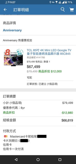 (再補個之前最殺的85c845) TCL 85吋 4K Mini LED顯示器 85C845 #141785 原價: 79499元 折價: 12880元 特價: 66619元 https://i.imgur.com/RH0OQUL.jpeg