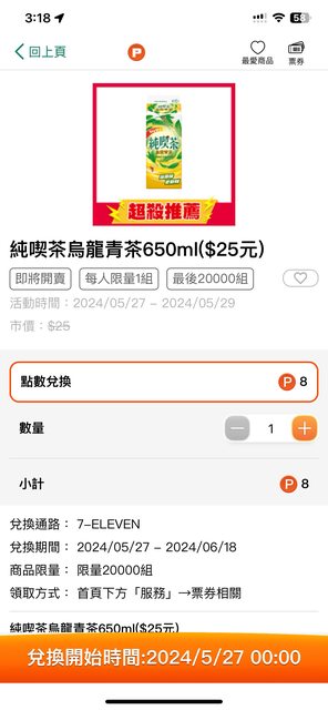 OPENPOINT App 7-11 純喫茶 烏龍青茶 650ml $25 5/27 00:00 開放兌換 每瓶8 OP 限量20000瓶 https://i.imgur.com/EJdKTUl.png