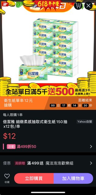 今天618活動還有看到一個倍潔雅12元的促銷