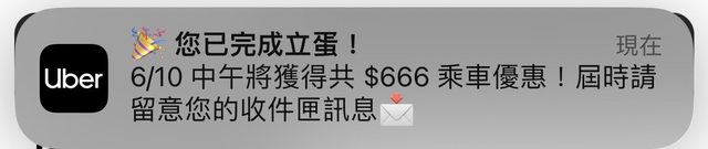 Uber這次端午節期間又有活動了! 蠻可愛的立蛋活動而且還蠻簡單就可以拿到優惠~ 只要在 6/10 中午12:00-13:00這段期間輸入【TWUBER666】 可以領到總共 $666 的優惠! 這時間點大家應該都蠻有空的XD 記得去領取一下很划! https://i.imgur.com/tgye0Aj.jpeg