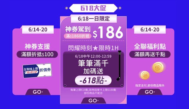 (2) 12:00-12:59限定1H,消費滿千加碼送618福利點,該時段單卡上限6,180福利點