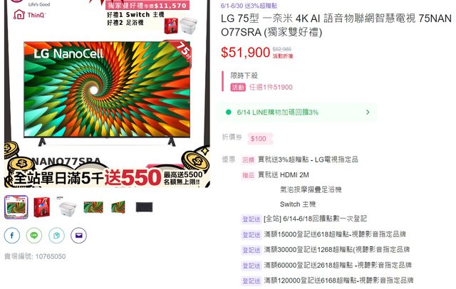 下單這台75吋LG 回饋金額近1萬 需要可參考