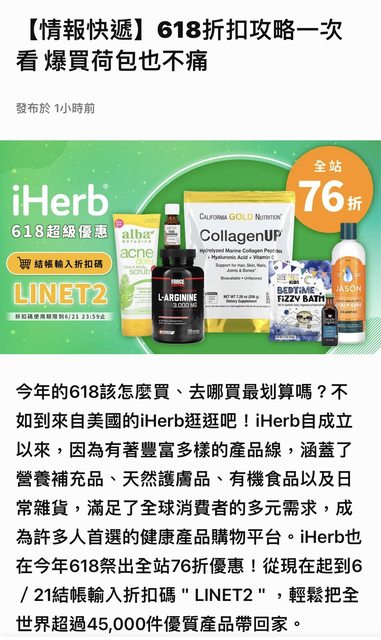 6/21前結帳輸入「LINET2」享全網76折優惠。 https://i.imgur.com/Qu39ldH.jpeg