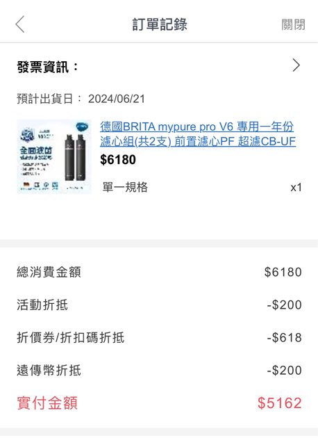 BRITA 櫥下V6濾心折後$5162 櫥下V6專用濾心 原價6990 特價6180 今天friday有618券 滿5000折618 剛試了蠻多都可以用 領券折618遠傳幣200放大成400 結帳價5162 https://i.imgur.com/9KUXvL0.jpeg