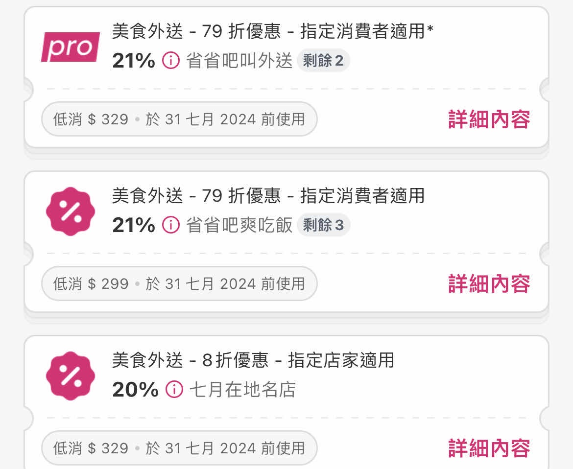 新聞連結:https://reurl.cc/70zkvN 這個月Pandapro的會員日折價規則有改 要輸入優惠碼才能使用 不要直接下單了XD ● 夏季必備手搖速食優惠 《省省吧販冰冰 》(7/1-7/31) 美食外送下訂指定餐廳指定品項享 75 折起優惠,訂單滿 $279 輸入優惠碼【省省吧販冰 冰 】再享 79 折,最高可折抵 $80,每人限使用 1 次 ▲ 7/2-7/15 美食外送下訂CoCo都可指定品項「奶茶三兄弟、檸檬冬瓜露」(大杯)享買一送一 ▲ 7/1-7/31 美食外送下訂珍煮丹指定品項「手熬黑糖檸檬」(大杯)享買一送一 ▲ 6/26-7/9 美食外送下訂漢堡王「花培雞堡餐」享買一送一 ▲ 7/4-7/17 美食外送下訂漢堡王「雙層火烤牛肉堡餐」享買一送一 ▲ 7/18-7/31 美食外送下訂漢堡王「花生培根牛肉堡餐」享買一送一 ▲ 7/1-7/31 美食外送下訂達美樂指定門市「個人獨享餐」享買一送一 《酷夏攻略》(7/15-8/15) 美食外送下訂鮮茶道指定店家,輸入優惠碼【酷夏攻略】滿 $250 享 85 折,最高折抵 $ 50,每人可使用一次 ▲ 7/15-8/15 美食外送下訂鮮茶道指定品項「紅心芭樂梅/墾丁Q果冰茶/皇家水果茶/荔枝QQ金萱/ 芒果Q烏龍」享 75 折 《省省喝五桐號》(7/1-7/31) 美食外送下訂五桐號指定店家,輸入優惠碼【省省喝五桐號】滿 $319 享 85 折,最高折 抵 $70,每人可使用一次 ● 大牌精選 《省省吃漢堡王》(7/2-7/31) 美食外送 pandapro 會員下訂漢堡王使用線上付款滿 $349 輸入優惠碼享 85 折,最高折 抵 $100,每人限使用 1 次,每日數量有限 ▲ 7/2 - 7/31 美食外送下訂漢堡王「華堡清爽餐」享 69 折 ▲ 7/1-7/31 美食外送每周五到週二下訂必勝客滿 $250 送一份副食 ▲ 7/1-7/31 美食外送下訂必勝客指定大比薩(共六種口味)享優惠價 $299 ▲ 7/1-7/31 美食外送下訂 Pasta Hut 指定紙包飯麵送一份副食 pandapro 會員贈單片起司卡滋餅 ▲ 7/1-7/31 美食外送下訂必勝客-霸王功夫雞專門店消費滿 $250 享現折 $30,pandapro 會員滿 $2 50 享現折 $50 ▲ 7/1-7/31 美食外送下訂必勝客披薩專賣店小披薩加贈一份相同口味小披薩 《省省啃德基》(7/3-7/16) 美食外送下訂肯德基消費滿 $339 輸入優惠碼享現折 $50 《省省啃蛋撻》(7/3-7/16) 美食外送下訂肯德基消費滿 $279 輸入優惠碼享現折 $30 《去拉亞找龍珠》(7/2-7/15) 美食外送下訂拉亞漢堡指定店家,輸入優惠碼【去拉亞找龍珠】滿 $319 享 85 折,最高 折抵 $70,每人可使用一次 ● pandapro 會員專屬優惠 《省省吧叫外送》(7/1-7/31) pandapro 指定用戶訂購美食外送滿額享 79 折,最高折$150,每人可用 2 次 《省省吧熊送》(7/1-7/31) pandapro 用戶使用 pandago 服務,可享運費 69 折,優惠最高折抵 $50,每人可使用 3 次 《省省吧來自取》(7/1-7/31) pandapro用戶限定使用,外帶自取指定店家滿指定金額享9折,最高折抵$50,每人可使用 3次 ● 超級會員日Super Pro Day 《PRODAY27》(7/3) -美食外送下訂海底撈,pandapro 會員消費滿 $329 享 7 折,最高折抵 $120(每人可使 用 1 次,數量有限) -美食外送下訂拉亞漢堡,pandapro 會員消費滿 $279 享 7 折,最高折抵 $80(每人可 使用 1 次,數量有限) 《PRODAY28》(7/10) 美食外送下訂漢堡王,pandapro 會員消費滿 $329 享 7 折,最高折抵 $120(每人可使用 1 次,數量有限) 《PRODAY29》(7/17) -美食外送下訂 KitchenNow,pandapro 會員消費滿 $329 享 7 折,最高折抵 $120(每 人可使用 1 次,數量有限) -美食外送下訂 85 度 C,pandapro 會員消費滿 $279 享 7 折,最高折抵 $80(每人可 使用 1 次,數量有限) 《PRODAY30》(7/24) -美食外送下訂六扇門,pandapro 會員消費滿 $329 享 7 折,最高折抵 $120(每人可使 用 1 次,數量有限) -美食外送下訂 Mister Donut,pandapro 會員消費滿 $279 享 7 折,最高折抵 $80(每 人可使用 1 次,數量有限) 《PRODAY31》(7/31) 美食外送下訂必勝客,pandapro 會員消費滿 $329 享 7 折,最高折抵 $120(每人可使用 1 次,數量有限) ● 美食外送優惠 《省省吧爽吃飯》(7/1-7/31) 美食外送消費滿額享最低 79 折 《七月在地名店》(7/1-7/31) 美食外送下訂指定店家,訂單滿額輸入優惠碼【七月在地名店】享8折優惠,最高折抵$80 ,每人限使用一次 ●生鮮雜貨 《省省吧菜菜》(7/6) 訂購生鮮雜貨精選傳統市場、楓康超市,滿 $799 享 75 折,最高折 $250,每人可用 1 次 《省省吧暑暑》(7/8-7/14) 夏季避暑好物|訂購生鮮雜貨精選店家(燦坤 、順發 3C、美妝保養類別),滿 $849 享 79 折,最高折 $250,每人可用 1 次 《省省吧涼涼》(7/8-7/14) 夏季消暑飲品|訂購生鮮雜貨精選店家(傳統市場、棉花田、楓康超市、OK 超商),滿 $399 享 8 折,最高折 $120,每人可用 1 次 ● 聯名卡優惠 《省省吧刷這張》(7/1-7/31) -使用中國信託 foodpanda 聯名卡下訂美食外送滿 $279 享 25% 胖達幣回饋,最高回饋 100 胖達幣,每人限用1次。 -使用中國信託 foodpanda 聯名卡下訂生鮮雜貨外送滿 $699 享 25% 胖達幣回饋,最高 回饋 250 胖達幣,每人限用1次。 -使用中國信託 foodpanda 聯名卡下訂外帶自取滿 $179 享 25% 胖達幣回饋,最高回饋 100 胖達幣,每人限用1次。 ● 信用卡優惠 《psjcb407》(7/1-7/31) JCB信用卡獨家優惠,全平台消費滿$300折$100,每人限用1次 《psctbc407》(7/1-7/31) 中國信託LINE Pay卡獨家優惠,全平台消費滿$260可折$20,每人限用1次 《psctbce407》(7/1-7/31) 中國信託LINE Pay卡獨家優惠,每日上午5:30至中午11:00,消費滿$200可折$15,每人限 用1次 ● pandago即時快遞優惠 《快送》(7/1-7/31) 首次使用 pandago 服務,可享運費5折,優惠最高折抵 $80 《幫我送》(7/1-7/31) 使用 pandago 服務,可享運費 85 折,優惠最高