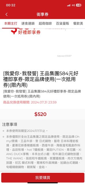 街口的街享卷本期主打 王品集團584元好禮即享卷520元 折扣低於九折 如果可以搭配7/5會員加碼 我算是逼近85折 感覺還行 https://i.imgur.com/eLcmyno.jpeg