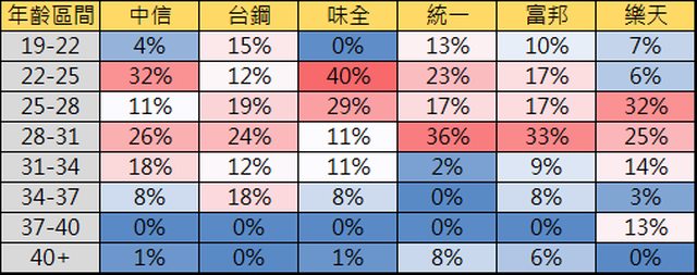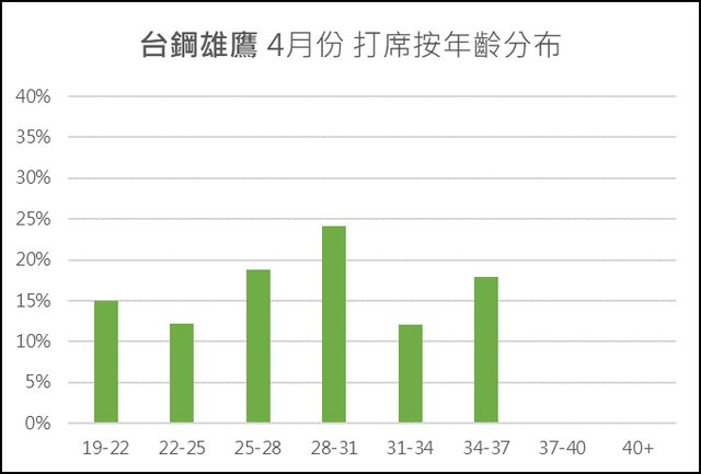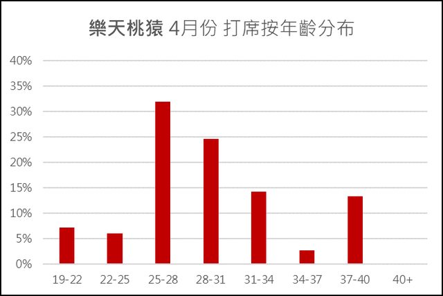 們還是可以看出樂天有著最多30歲以上的球員打席(30.2%),包括了朱育賢(33歲)、林泓育(