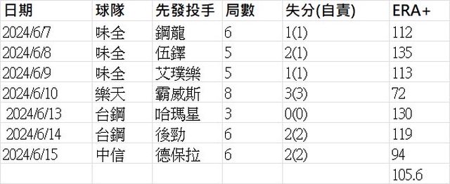 → mimi9672: 投手ERA+是本季的累積數據噢 也就是他們都算是強力洋投 06/16 01:05