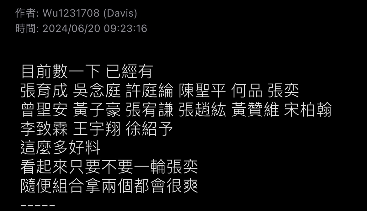 推 ysy2003: 李致霖 我會擺在下一梯的頭 張宥謙會跟王宇翔擺在一起 06/20 09:49