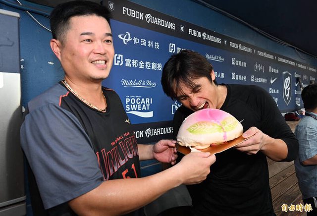 陳鏞基笑說,今天賽前,胡金龍就拿了顆大壽桃要給他,說:「他說蛋糕是小孩子在吃的