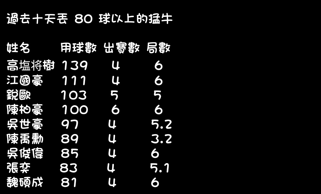 → oscar8721184: 更別說 牛棚準備每天都還要加熱身的球數進去 08/29 21:44