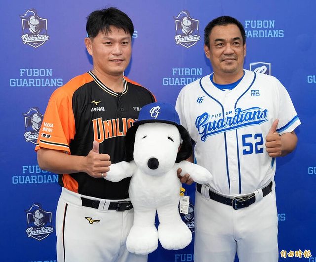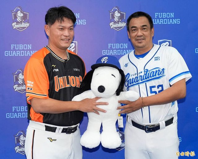 富邦悍將總教練陳金鋒(右)送上史努比大布偶給統一獅潘威倫(左)。(記者陳志曲攝