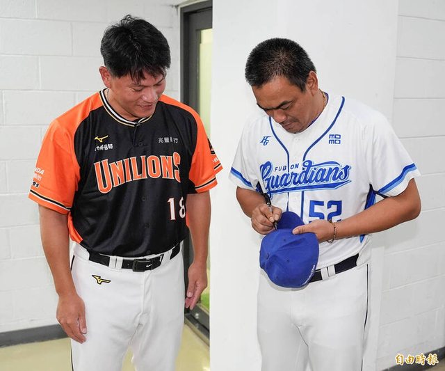 統一獅潘威倫(左)拿著球帽請富邦悍將總教練陳金鋒(右)簽名。(記者陳志曲攝)