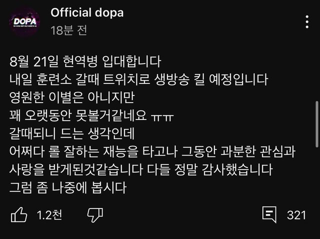 剛剛才在韓網發現的消息,Dopa這次真的入伍了==
