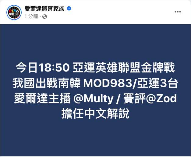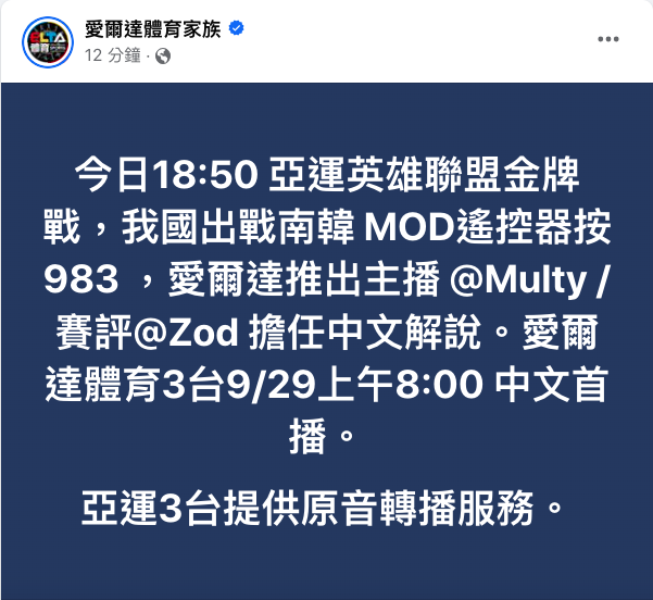 推 YuiiAnitima : 公告了 亞運三台中文轉播 09/29 01:09