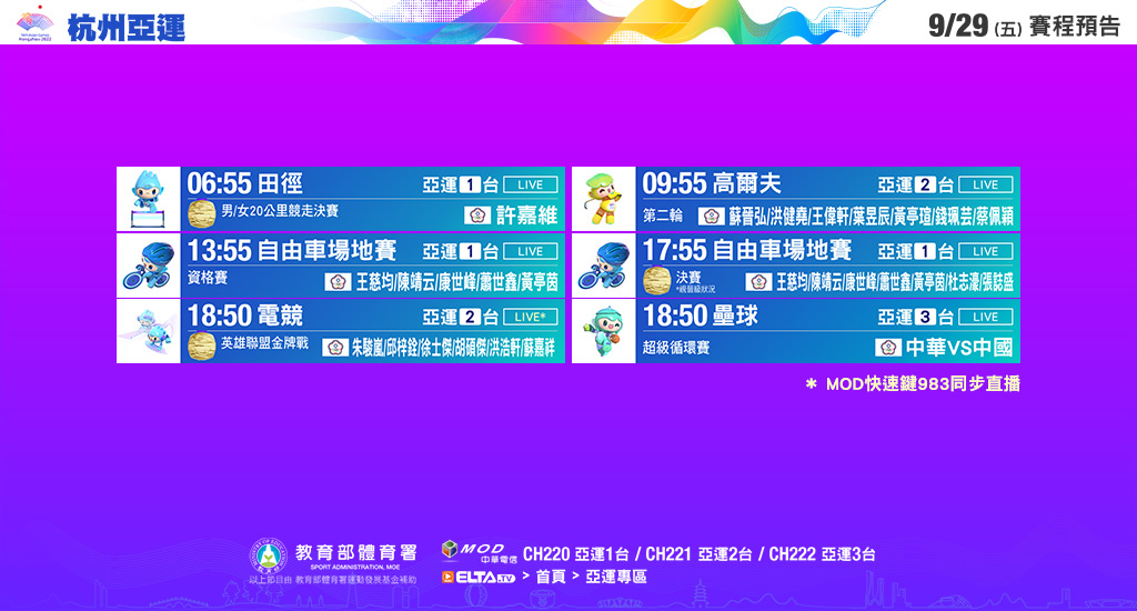 → lgng66133 : 有標記MOD983同步直播 那就是同個轉播訊號 09/29 01:01