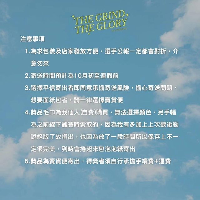 (3)得獎者須自行負擔運費及包材費(台北可面交,須配合我的時間)