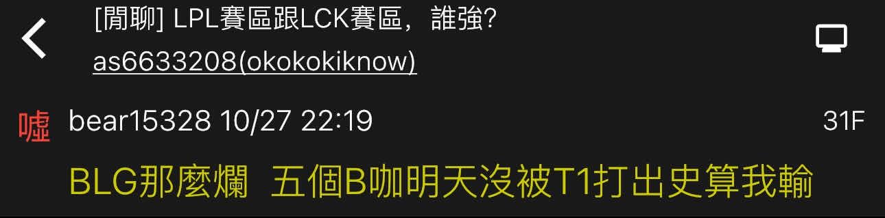 噓 bear15328 : BLG那麼爛 五個B咖明天沒被T1打出史算我輸 10/27 22:19
