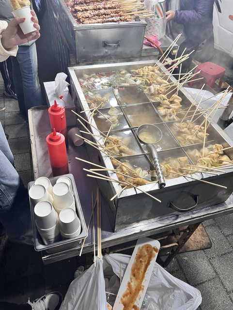 有兩攤小吃賣關東煮跟熱狗薯條等熱食