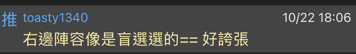 → toasty1340 : 當然沒想到到了八強賽真的有一個五隻盲選的 11/18 23:37