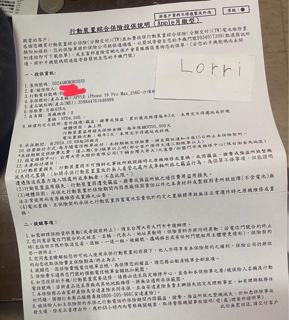 台灣大哥大竊盜、毀損保險,自購買日起一個月