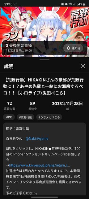 推 r901700216: 查了一下 明天下午HIKAKIN會開荒野台 11/24 23:25