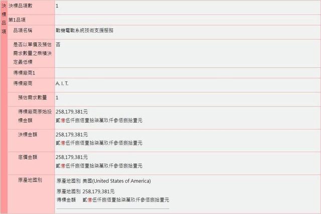 AIT),以限制性招標向美採購「戰機電戰系統技術支援服務」,決標金額達新台幣2億