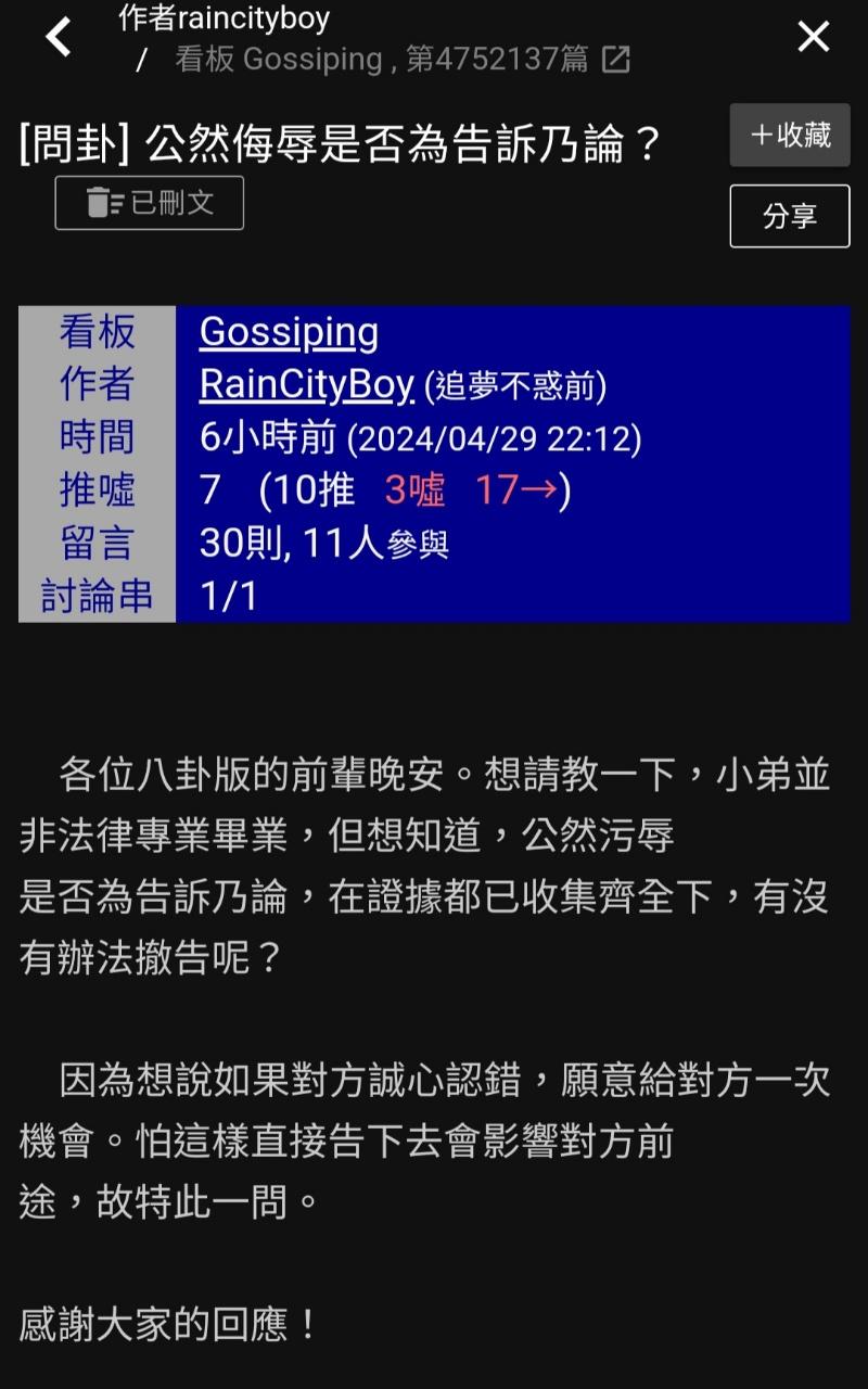 → RainCityBoy : 自己跳進來攻擊我,又說我要對你提告,從頭到尾都是 04/30 04:54