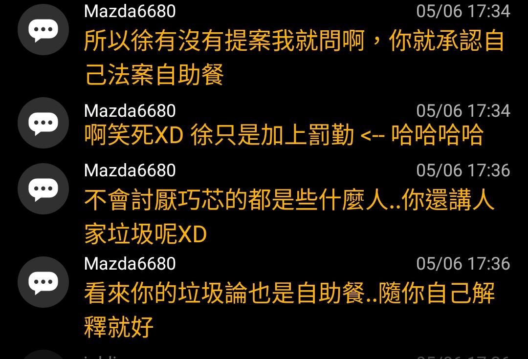 → jobli : 我等馬自達給我這個法案是徐巧芯提案,行政院跟國防 05/06 15:59