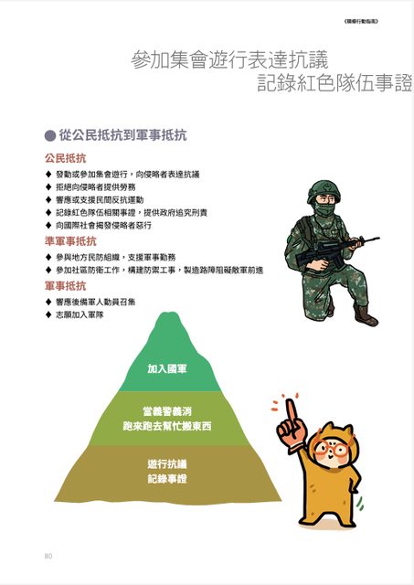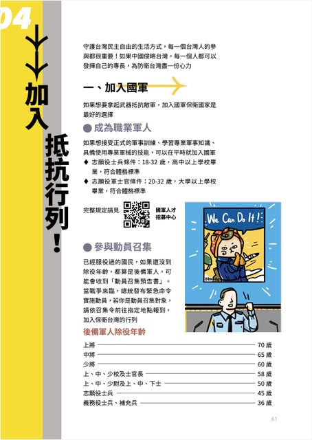 → crow0801 : 台灣的法律架構明明很清楚 民防是非武裝抵抗 後備 05/12 00:37