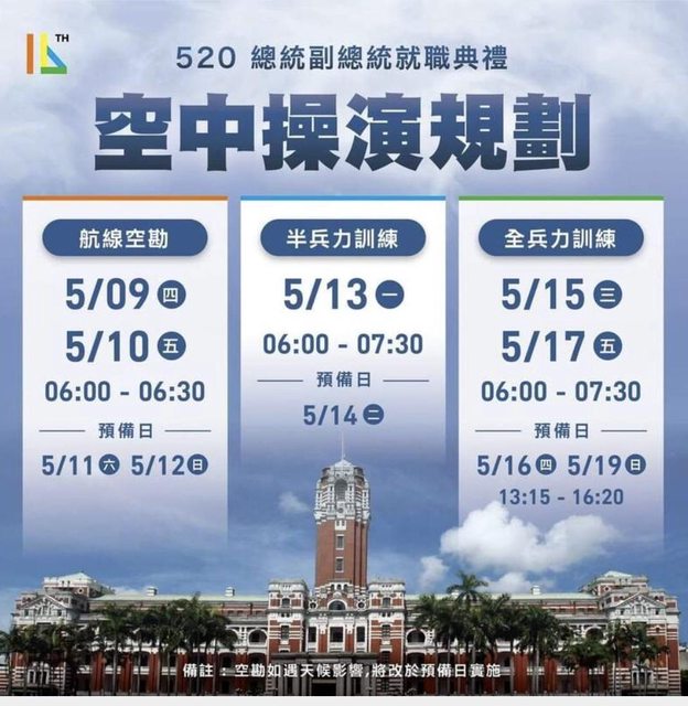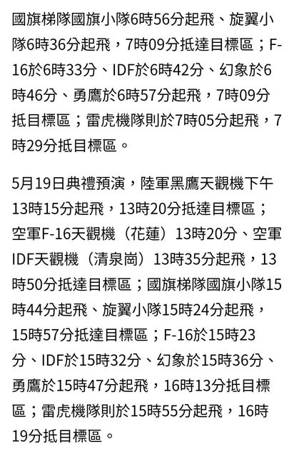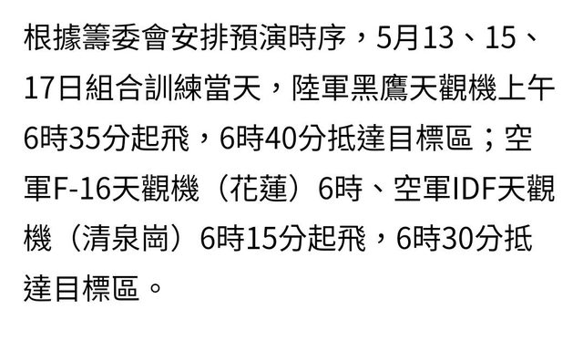 如題,因應520總統就職表演暨組合訓練,陸軍旋翼機隊及空軍戰鬥聯隊將於明日清晨開