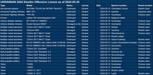 截至 2024 年 5 月 20 日已確認進攻裝備損失